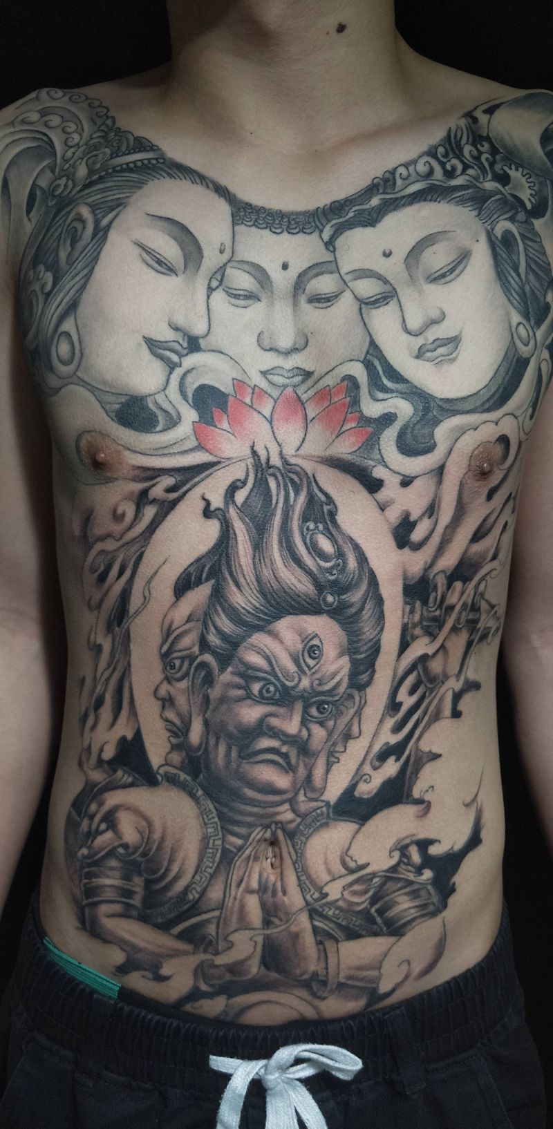 前甲三面佛不动明王纹身图片_胸部腹部新传统三面佛不动明王花肚纹身图案