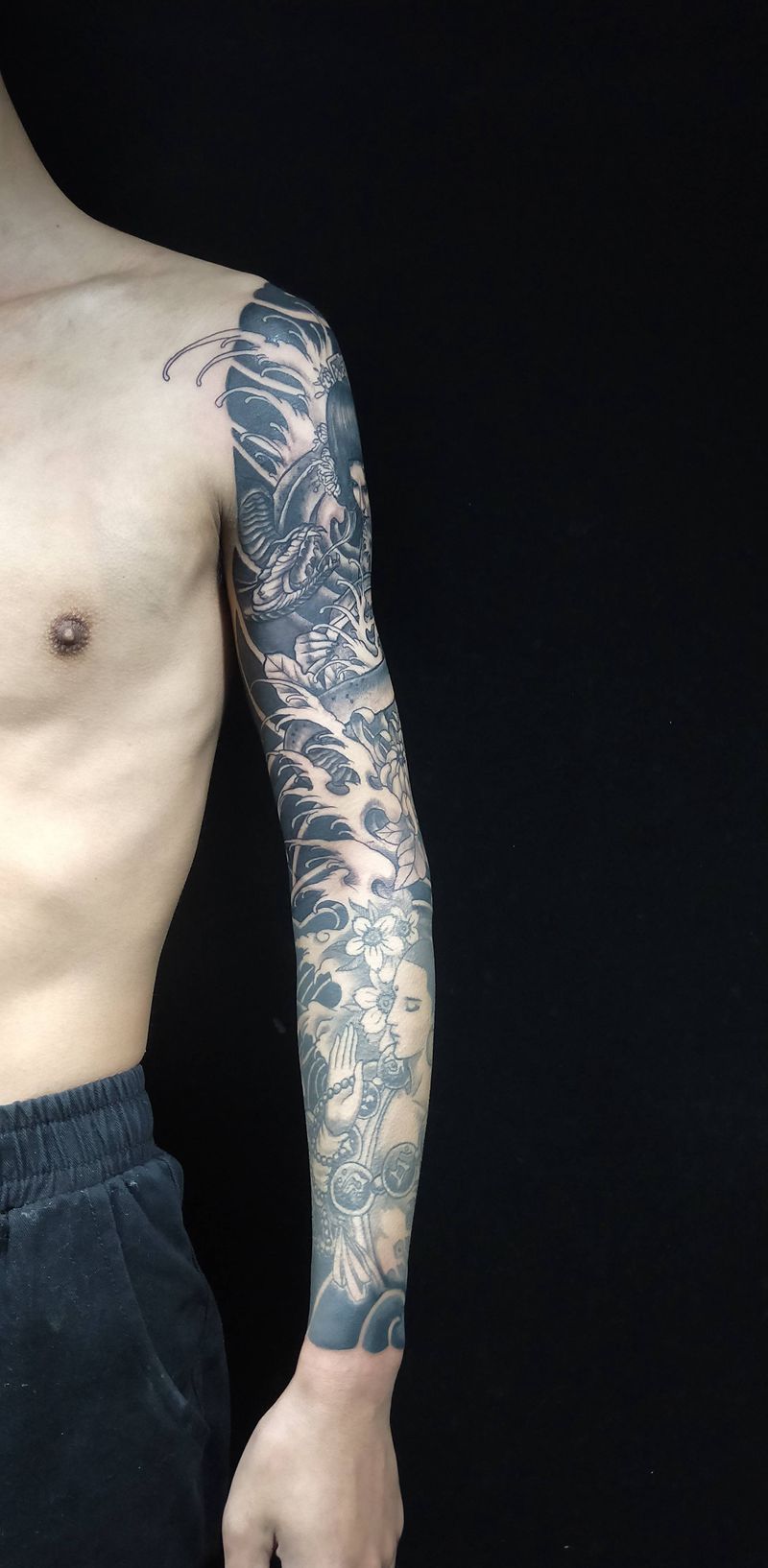 日式花臂纹身图片_手臂老传统新传统艺伎达摩日式纹身图案