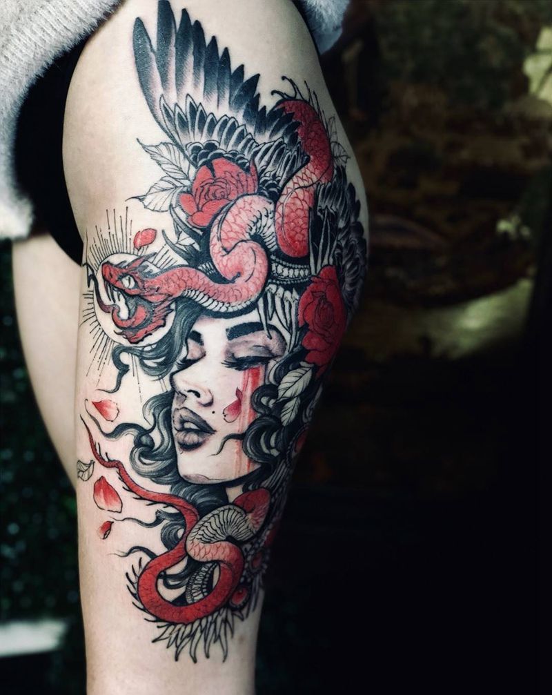 • T网红王老大花腿龙纹身图片_腿部新传统纹身图案
