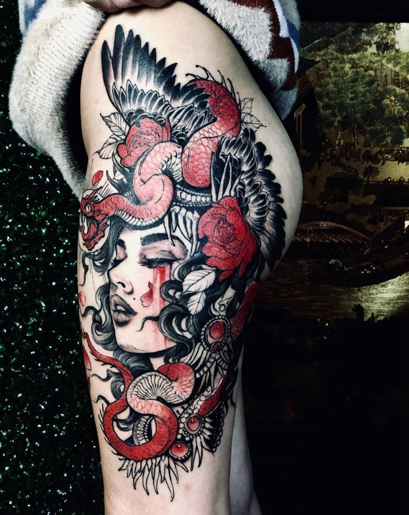 • T网红王老大花腿龙纹身图片_腿部新传统纹身图案