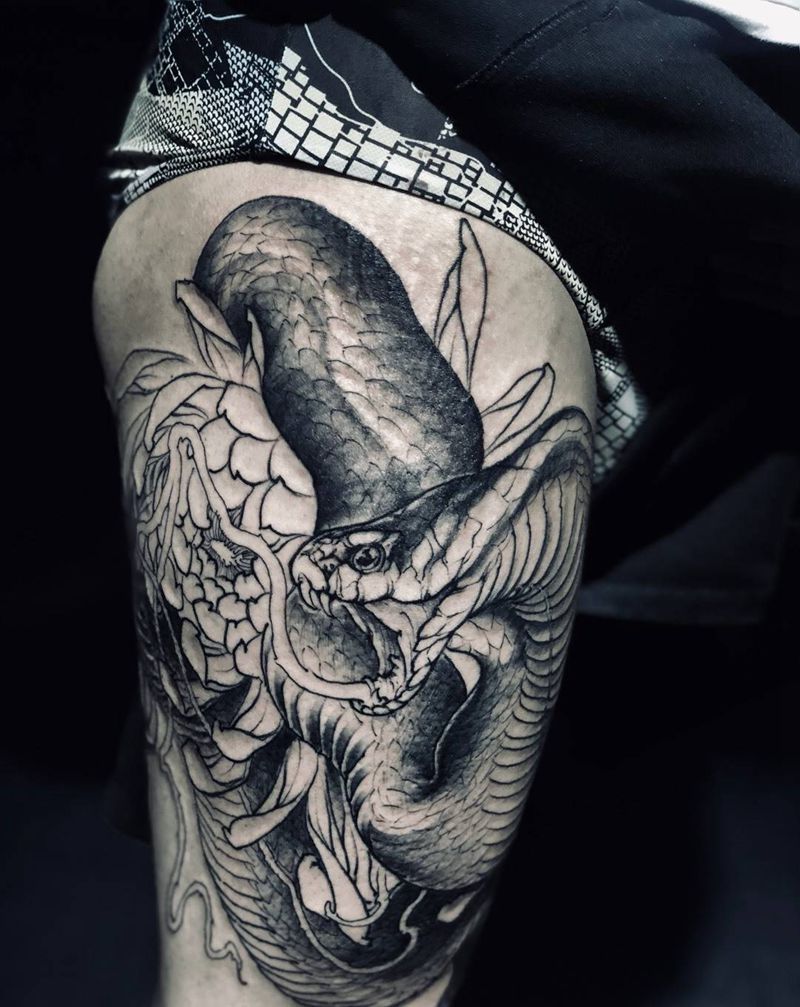 • T网红王老大花腿龙纹身图片_腿部新传统纹身图案