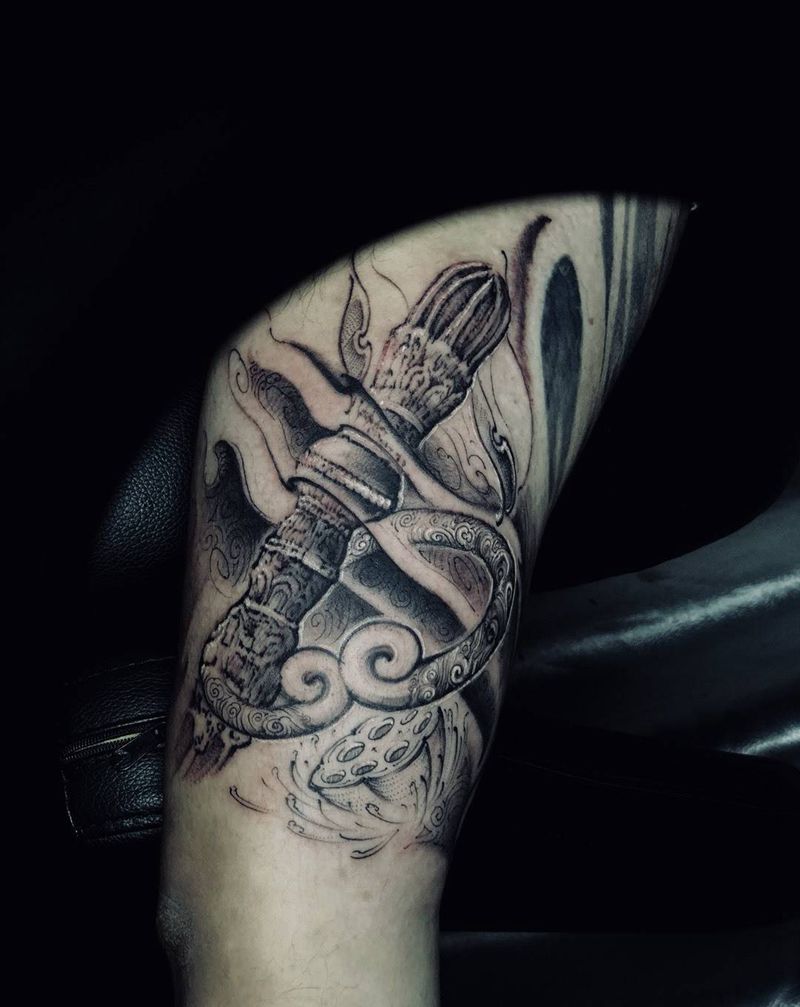 • T网红王老大花腿龙纹身图片_腿部新传统纹身图案