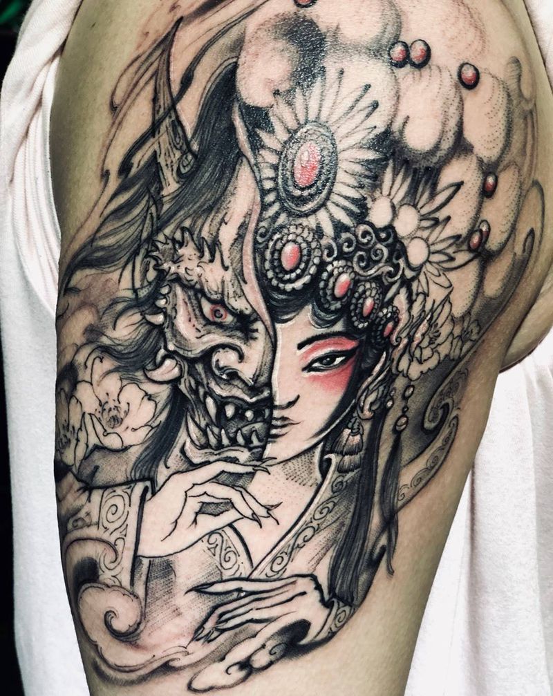 当前位置: 首页 >广东省广州市纹身店-東刺青纹身工作室纹身图案>花旦般若纹身图片