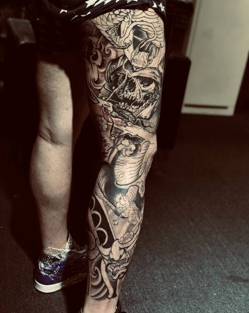• T网红王老大花腿龙纹身图片_腿部新传统纹身图案