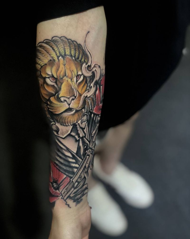 当前位置: 首页 >广东省广州市纹身店-東刺青纹身工作室纹身图案>狮子大叔纹身图片_手臂New School水墨纹身图案