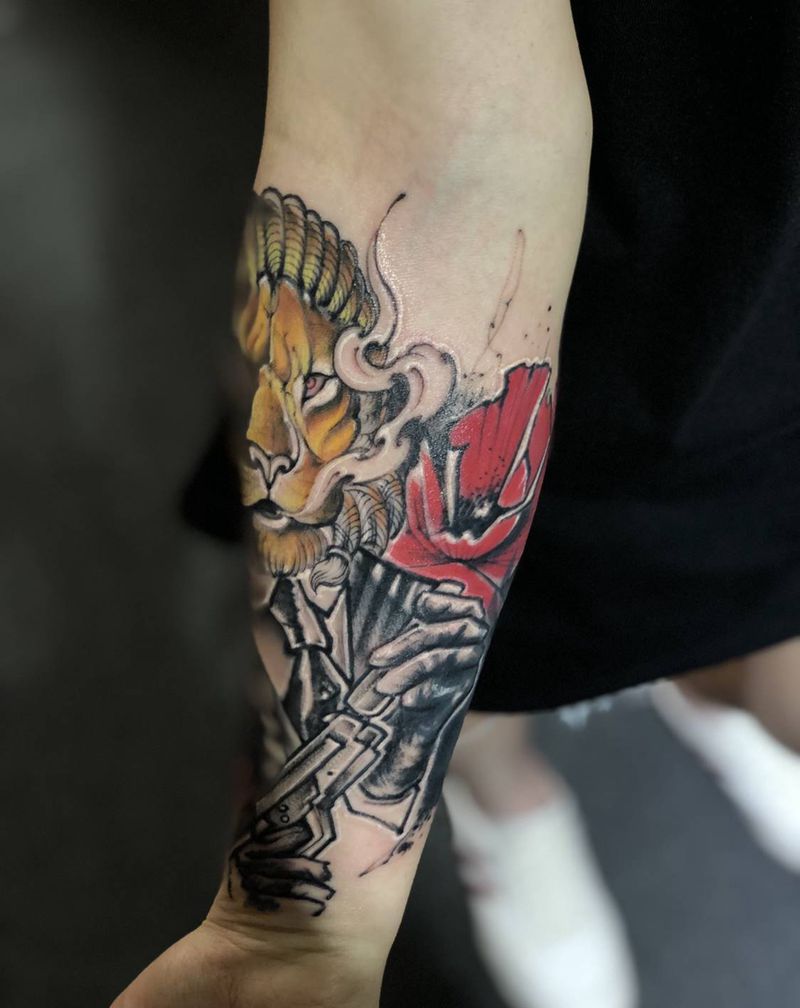 当前位置: 首页 >广东省广州市纹身店-東刺青纹身工作室纹身图案>狮子大叔纹身图片_手臂New School水墨纹身图案