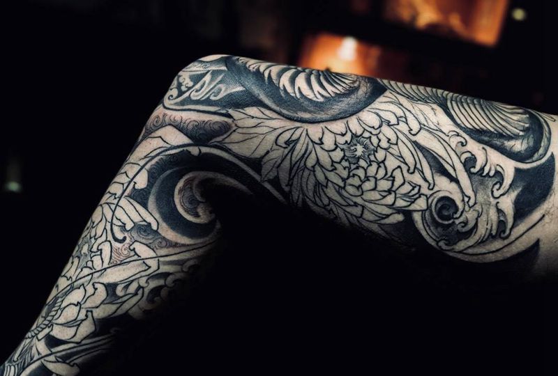 • T网红王老大花腿龙纹身图片_腿部新传统纹身图案