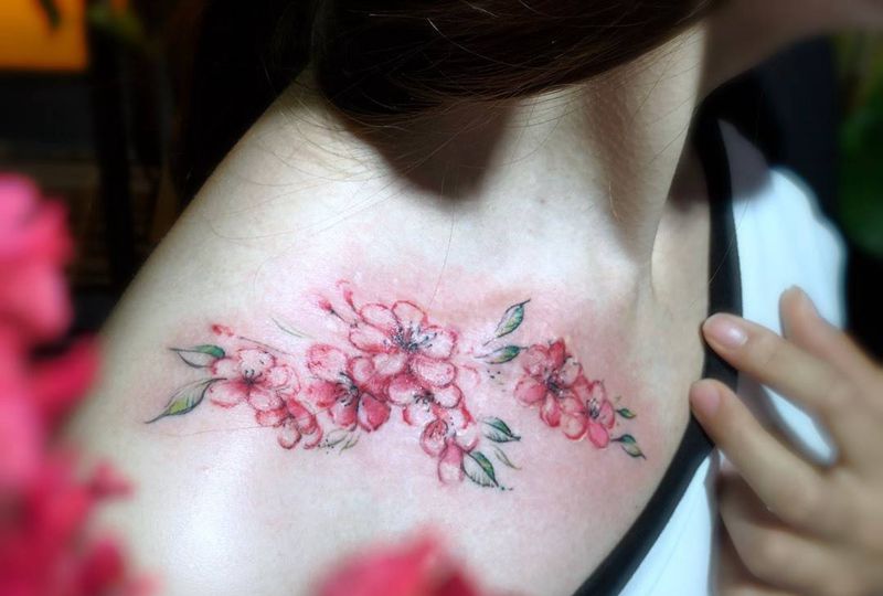 樱花覆盖疤痕纹身图片_颈部肩部水彩纹身图案