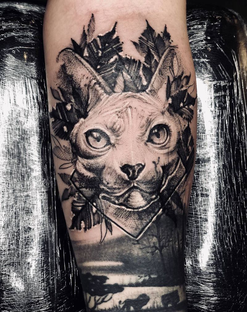 无毛猫愿创纹身图片_手臂点刺欧美写实纹身图案
