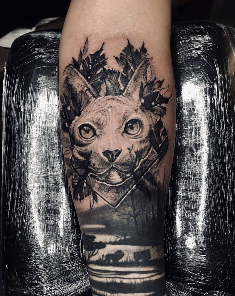 无毛猫愿创纹身图片_手臂点刺欧美写实纹身图案