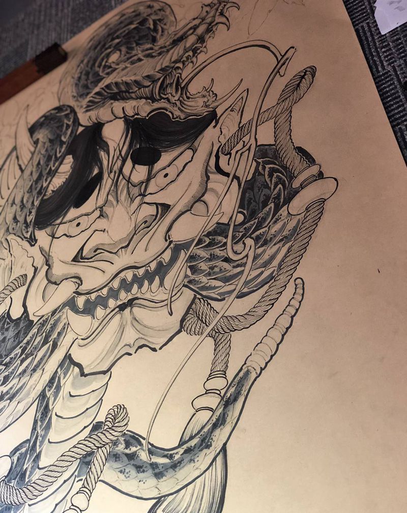 当前位置: 首页 >广东省广州市纹身店-東刺青纹身工作室纹身图案>新老传统结合般若手稿纹身图片_背部腿部新传统老传统纹身图案