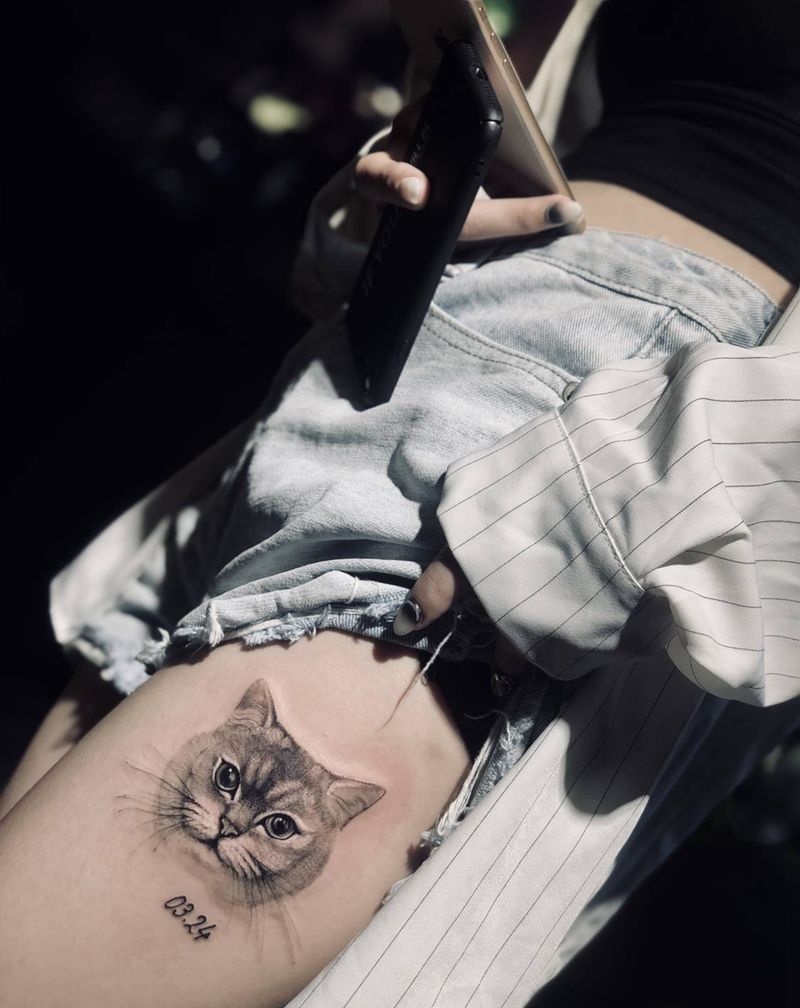 小猫咪纹身图片_腿部点刺欧美写实纹身图案