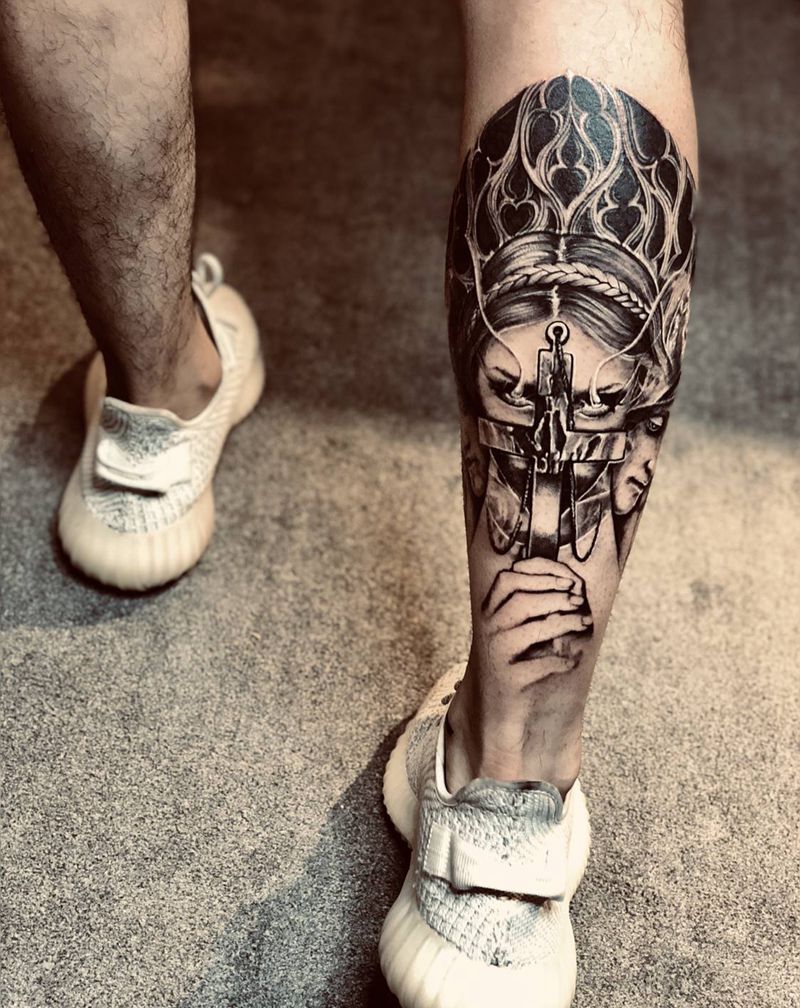 来自地狱的修女纹身图片_腿部欧美写实点刺纹身图案