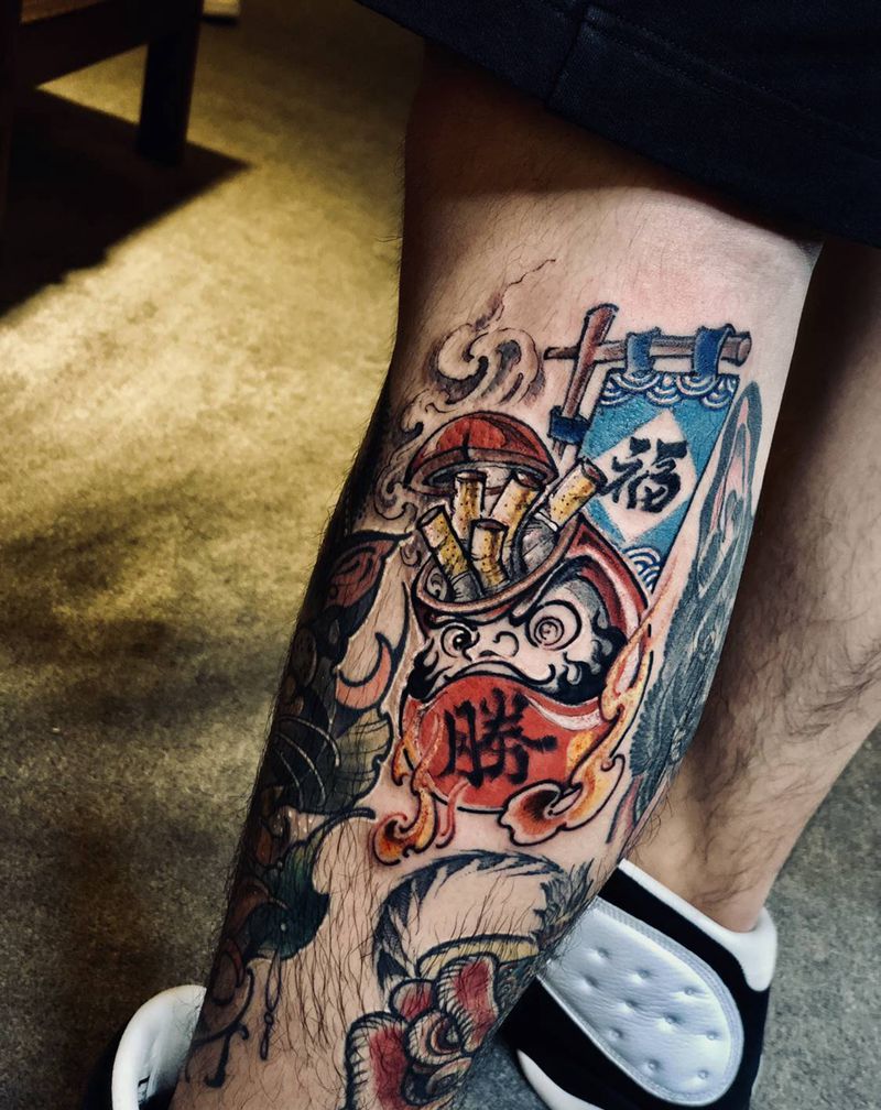 当前位置: 首页 >广东省广州市纹身店-東刺青纹身工作室纹身图案>达摩蛋纹身图片_腿部New School纹身图案