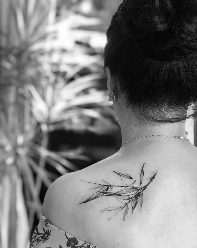 疤痕覆盖(一叶竹林)纹身图片_肩部水墨点刺纹身图案