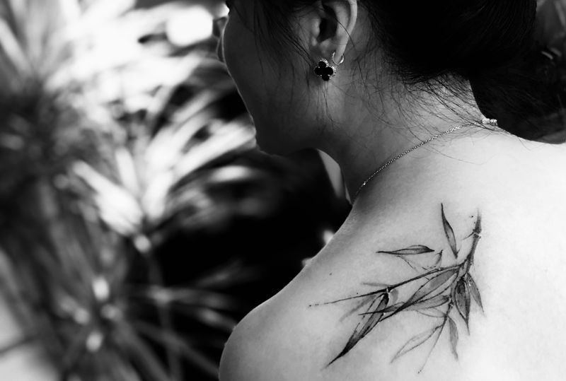 疤痕覆盖(一叶竹林)纹身图片_肩部水墨点刺纹身图案