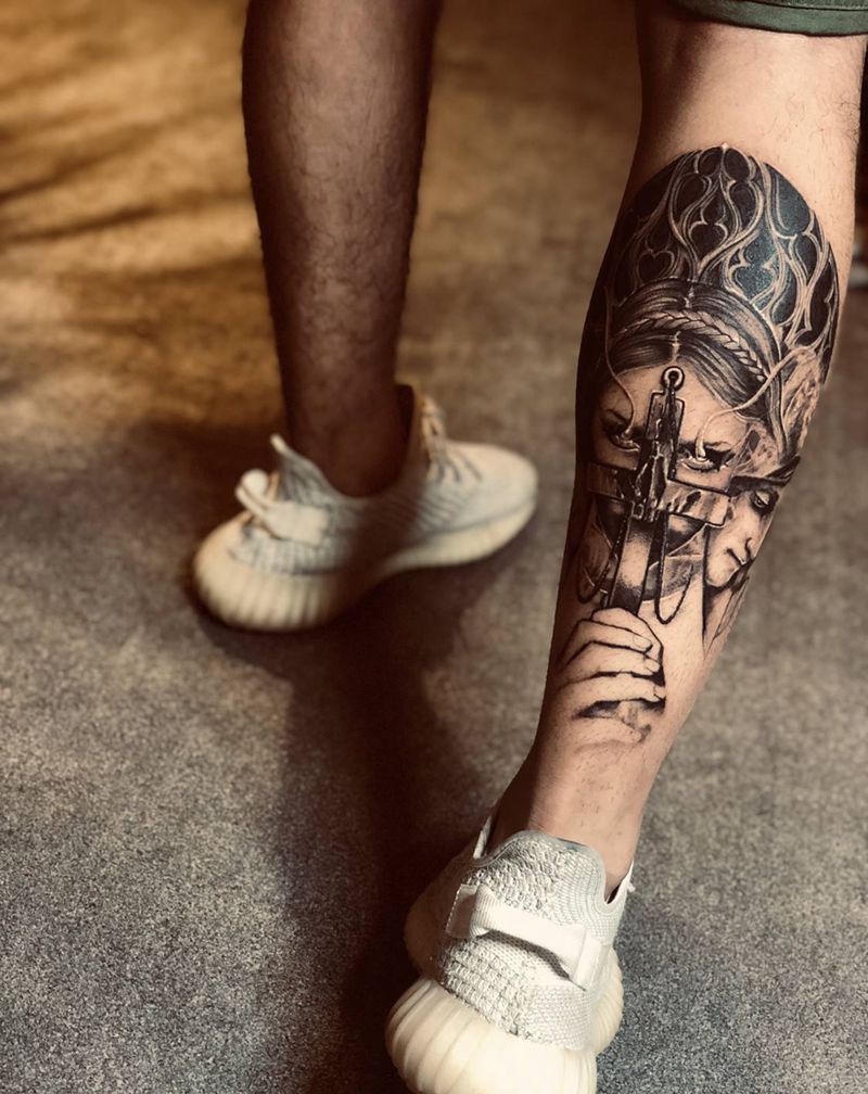 暗黑修女恢复后纹身图片_腿部点刺欧美写实纹身图案
