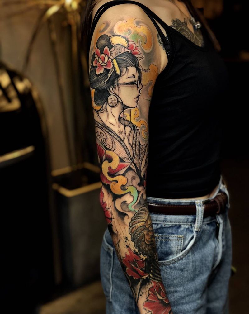当前位置: 首页 >广东省广州市纹身店-東刺青纹身工作室纹身图案>艺妓狮子座♌️纹身图片_手臂New School点刺纹身图案