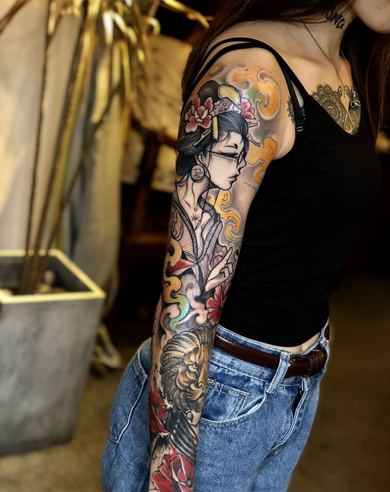 当前位置: 首页 >广东省广州市纹身店-東刺青纹身工作室纹身图案>艺妓狮子座♌️纹身图片_手臂New School点刺纹身图案