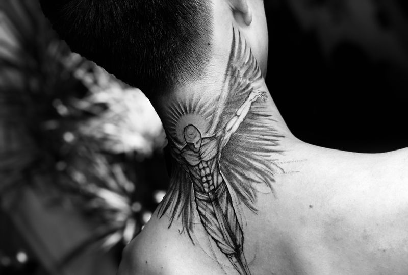 当前位置: 首页 >广东省广州市纹身店-東刺青纹身工作室纹身图案>堕落天使纹身图片_颈部点刺几何纹身图案