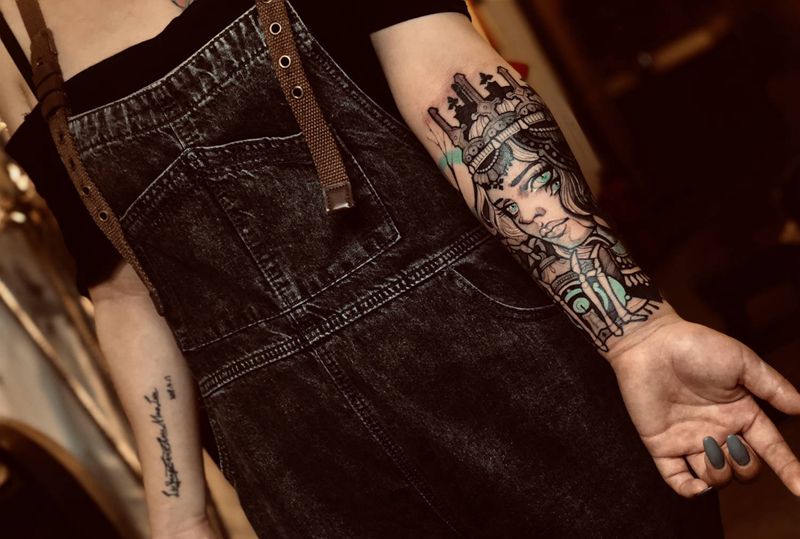 当前位置: 首页 >广东省广州市纹身店-東刺青纹身工作室纹身图案>旧图覆盖纹身图片_手臂New School点刺纹身图案