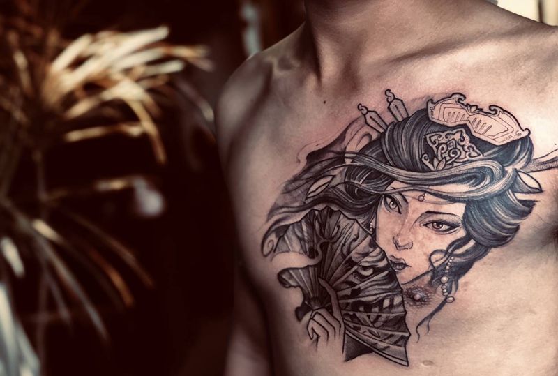 当前位置: 首页 >广东省广州市纹身店-東刺青纹身工作室纹身图案>艺妓纹身图片_胸部新传统老传统纹身图案