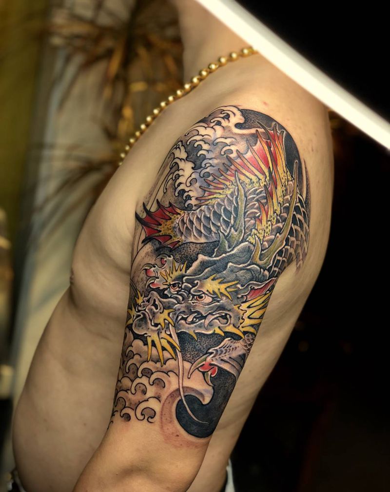 • T网红王老大花腿龙纹身图片_腿部新传统纹身图案