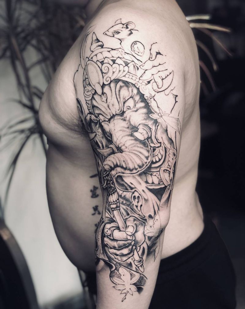 当前位置: 首页 >广东省广州市纹身店-東刺青纹身工作室纹身图案>临摹作品象神纹身图片_手臂新传统老传统纹身图案