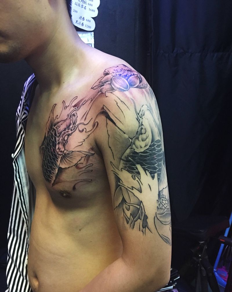 鲤鱼遮盖纹身图片_成品胸部手臂传统动物纹身图案