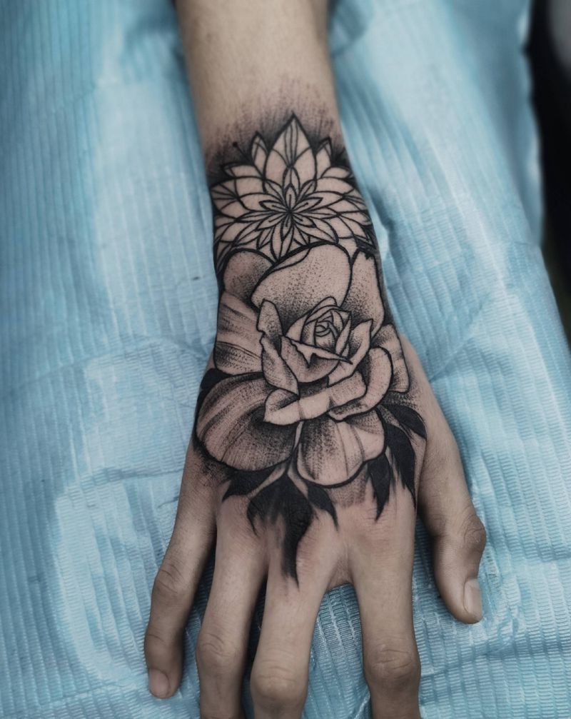 • 手背潮流时尚的玫瑰花眼睛纹身图案