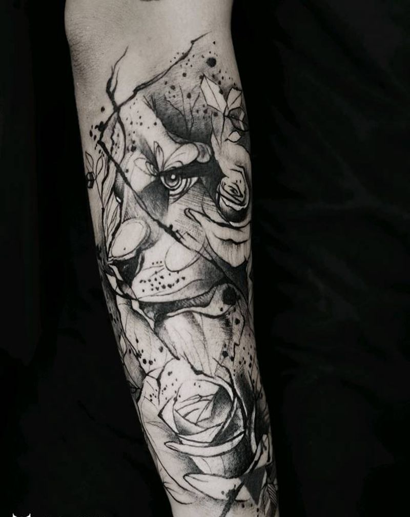 狮子纹身图片_手臂水墨欧美写实纹身图案