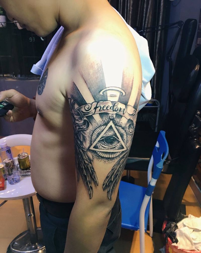 当前位置: 首页 >广东省广州市纹身店-疯也刺青纹身图案>上帝之眼与天使翅膀纹身图片_手臂纹身图案