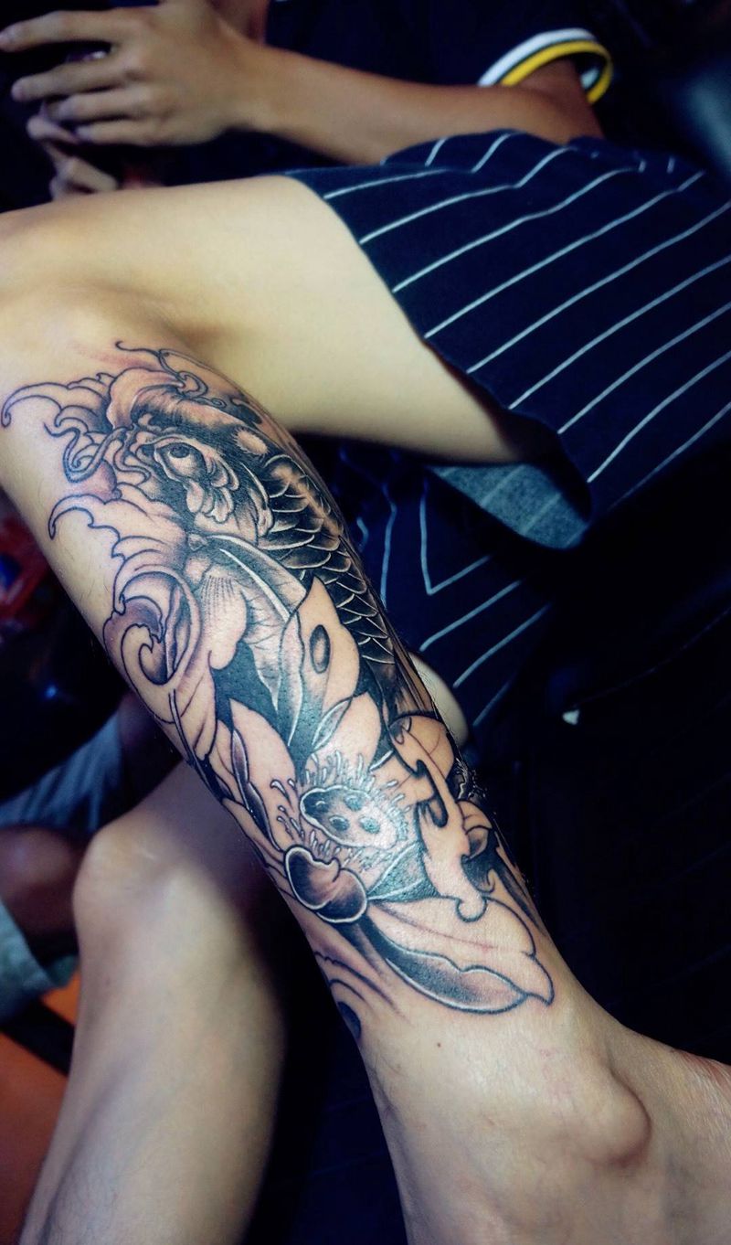 当前位置: 首页 >广东省广州市纹身店-疯也刺青纹身图案>鲤鱼莲花纹身图片