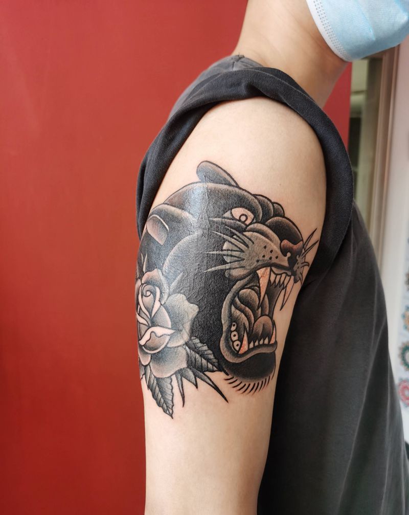 当前位置: 首页 >广东省广州市纹身店-赤艺old schooltattoo纹身图案>old school 黑豹遮盖纹身图片_手臂Old School黑豹纹身图案