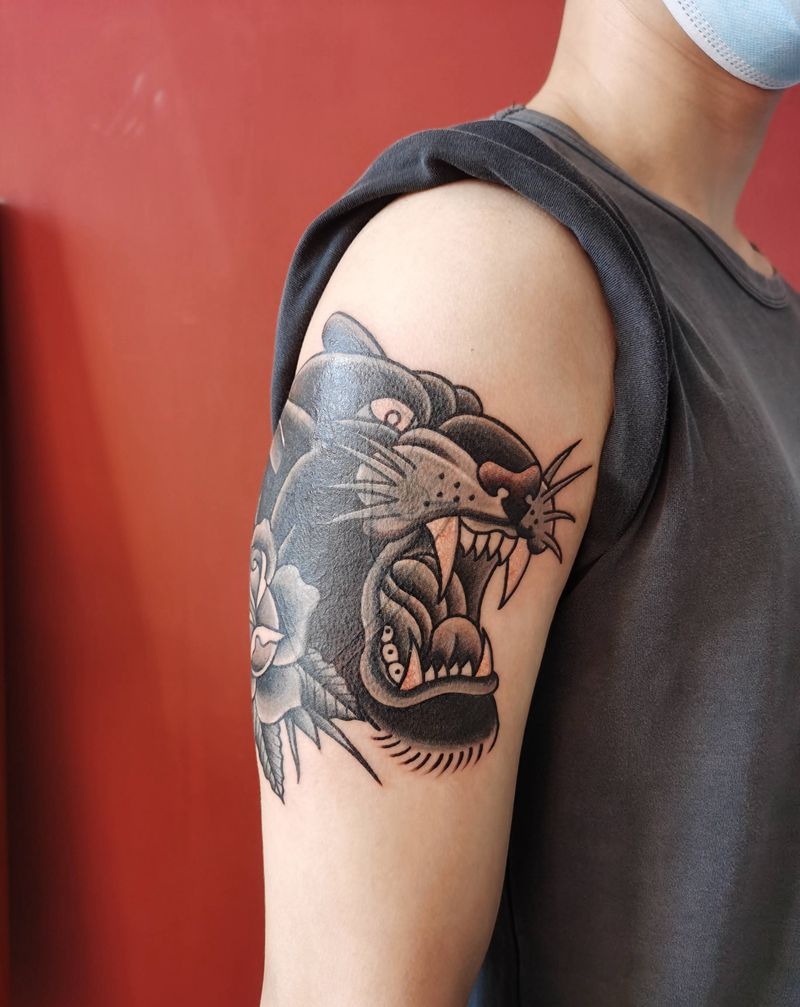 当前位置: 首页 >广东省广州市纹身店-赤艺old schooltattoo纹身图案>old school 黑豹遮盖纹身图片_手臂Old School黑豹纹身图案