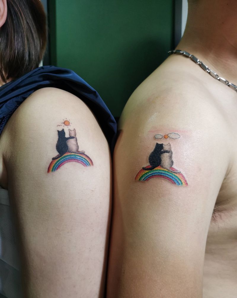 当前位置: 首页 >广东省广州市纹身店-赤艺old schooltattoo纹身图案>猫咪哥俩好纹身图片_手臂New School猫纹身图案