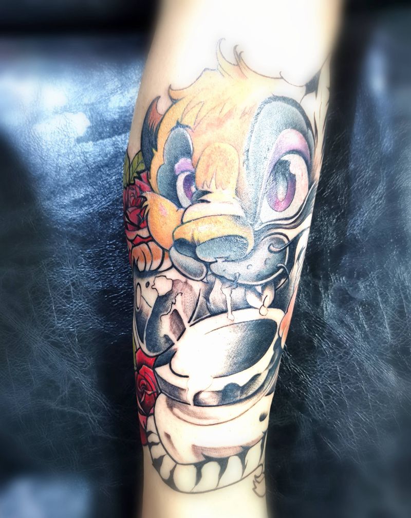 贪吃的萌虎纹身图片_腿部New School老虎玫瑰纹身图案