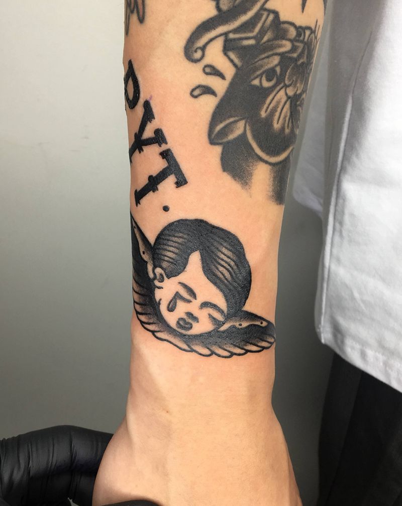 当前位置: 首页 >广东省广州市纹身店-赤艺old schooltattoo纹身图案>old school 小天使纹身图片_手臂Old School纹身图案