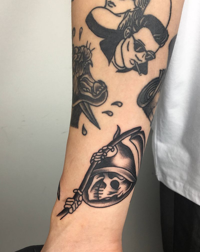 当前位置: 首页 >广东省广州市纹身店-赤艺old schooltattoo纹身图案>old school死神纹身图片_手臂Old School纹身图案