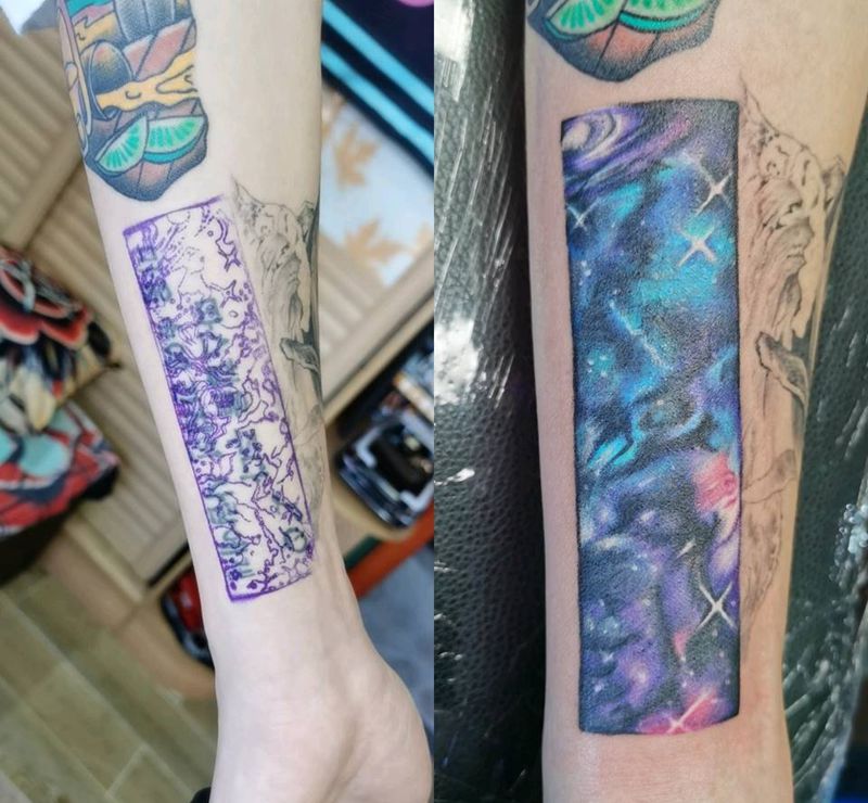 当前位置: 首页 >广东省广州市纹身店-赤艺old schooltattoo纹身图案>星空条遮盖纹身图片_手臂水彩银河纹身图案