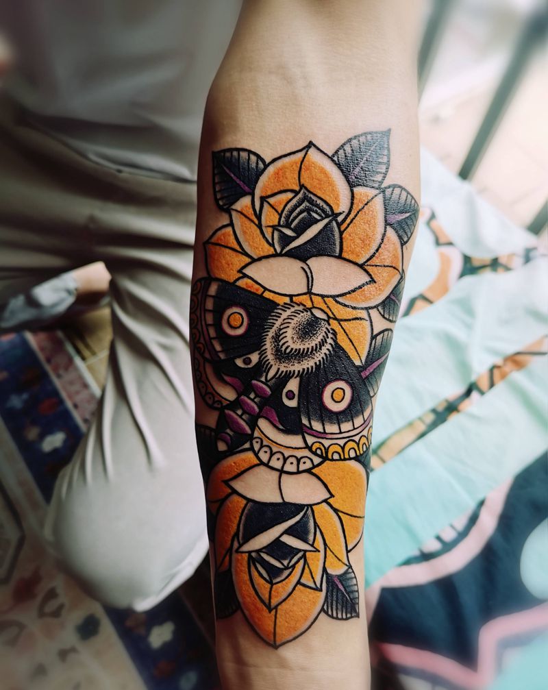 当前位置: 首页 >广东省广州市纹身店-赤艺old schooltattoo纹身图案>飞蛾扑玫瑰纹身图片_手臂Old School点刺飞蛾纹身图案