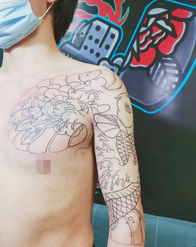 牡丹鲤鱼半甲纹身图片_胸部手部老传统新传统纹身图案