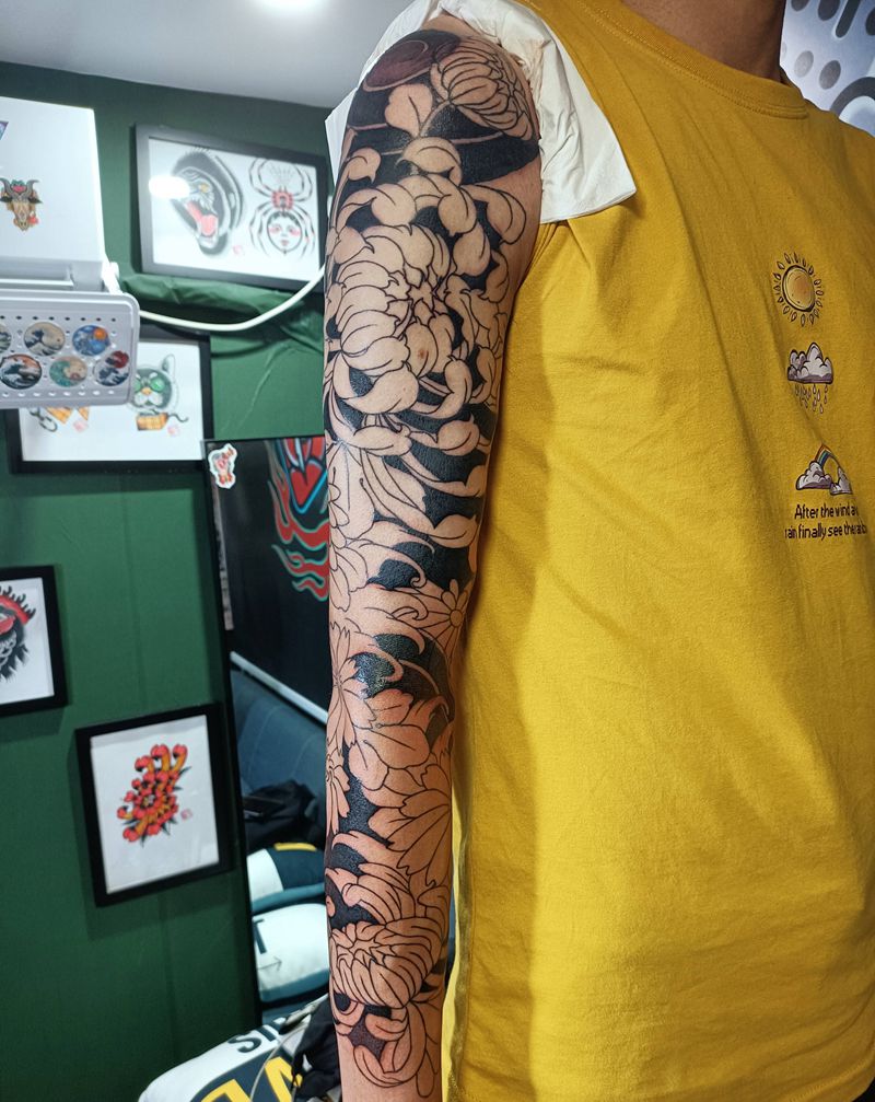 当前位置: 首页 >广东省广州市纹身店-赤艺old schooltattoo纹身图案>(花臂)未完成纹身图片_肩部手臂老传统新传统花纹身图案