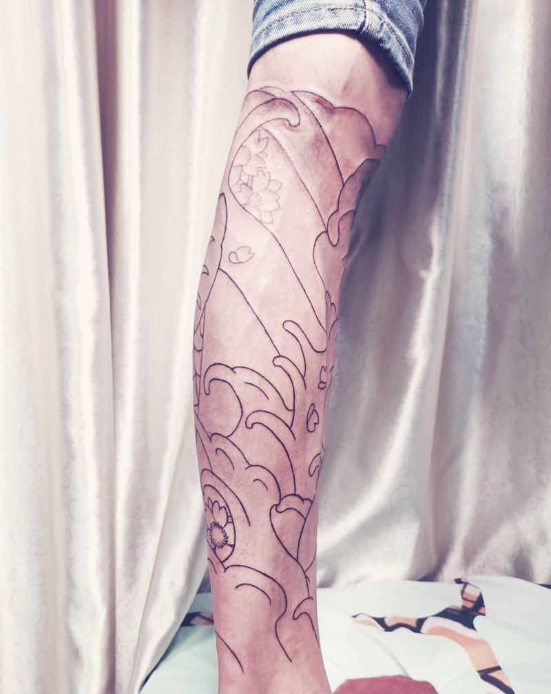 • T网红王老大花腿龙纹身图片_腿部新传统纹身图案