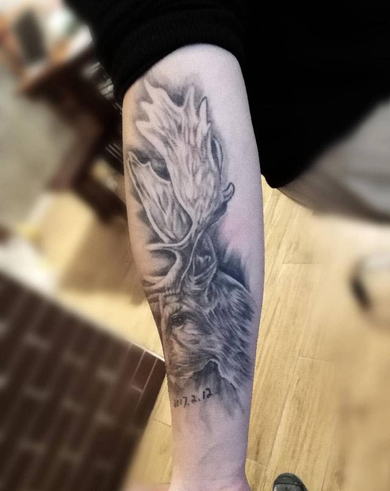 当前位置: 首页 >广东省广州市纹身店-增城新刺客纹身工作室纹身图案>一年前的麋鹿加背景包臂纹身图片