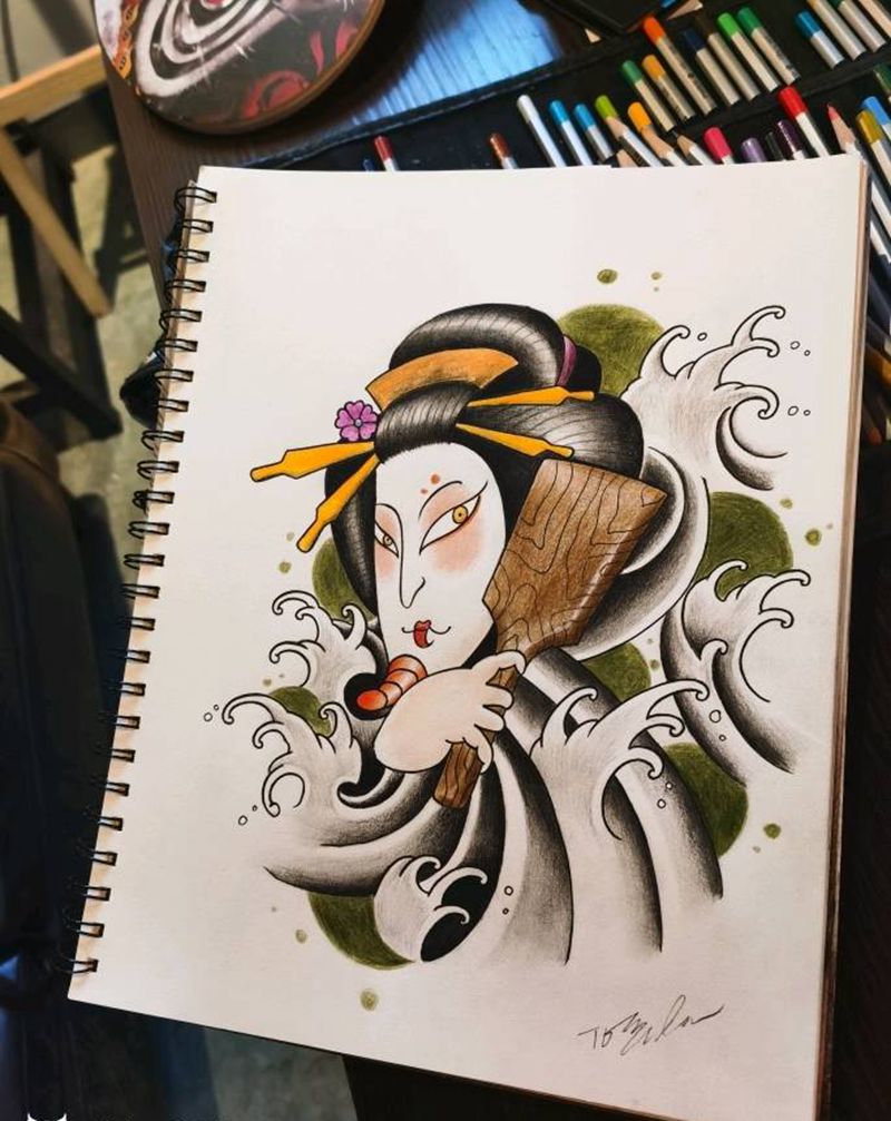 当前位置: 首页 >广东省广州市纹身店-广州增城新刺客纹身工作室纹身图案>艺妓手稿纹身图片_新传统老传统纹身图案