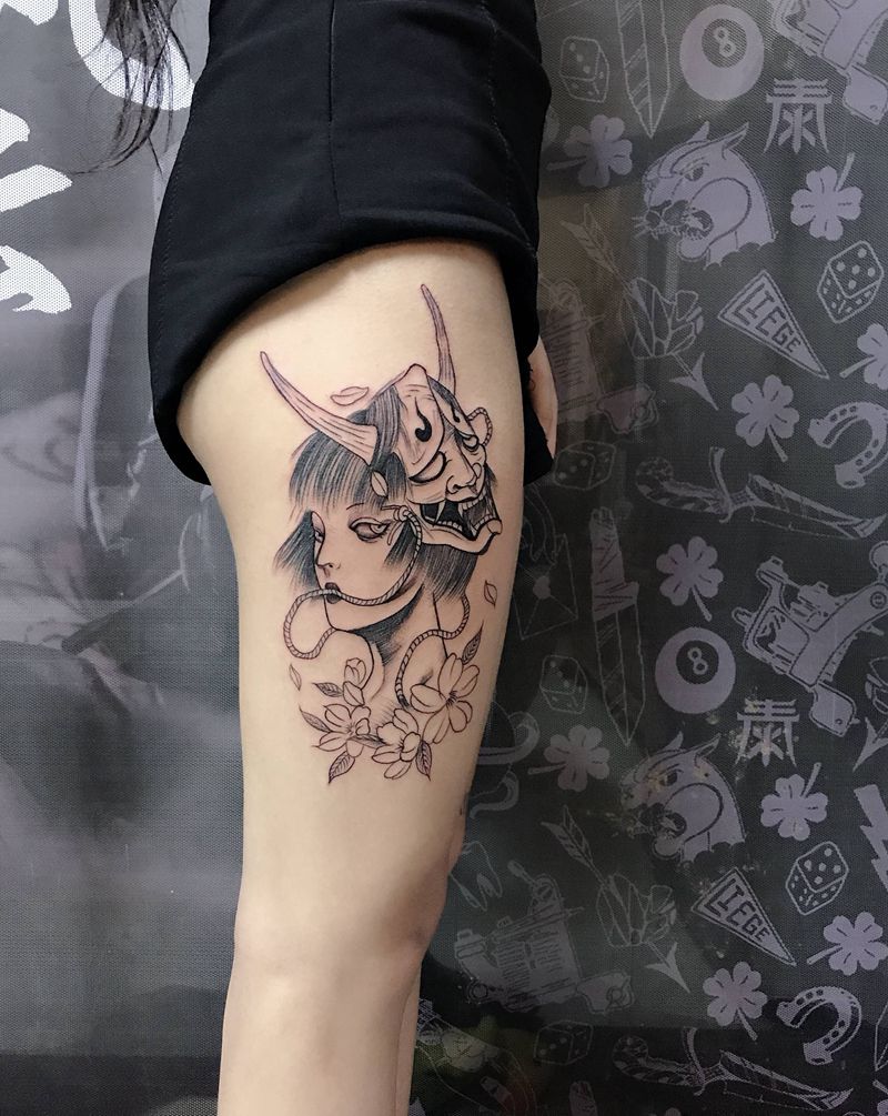 面具美女纹身图片_腿部新传统美女 般若素描纹身图案