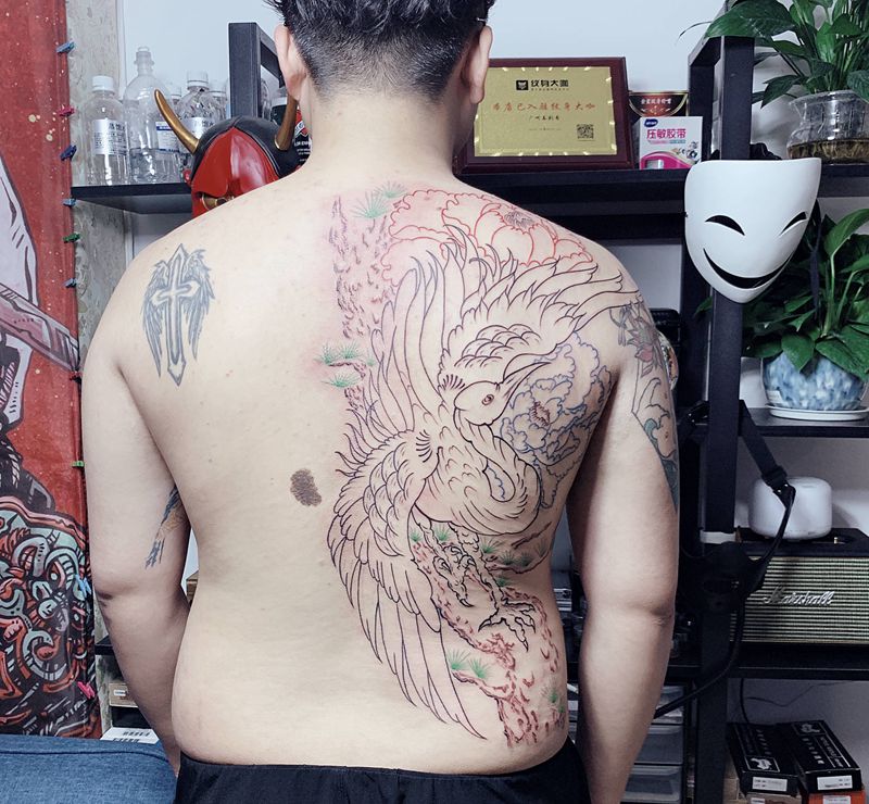 当前位置: 首页 >广东省广州市纹身店-泰塔凸纹身馆纹身图案>松鹤延年纹身图片_背部新传统仙鹤松树牡丹纹身图案