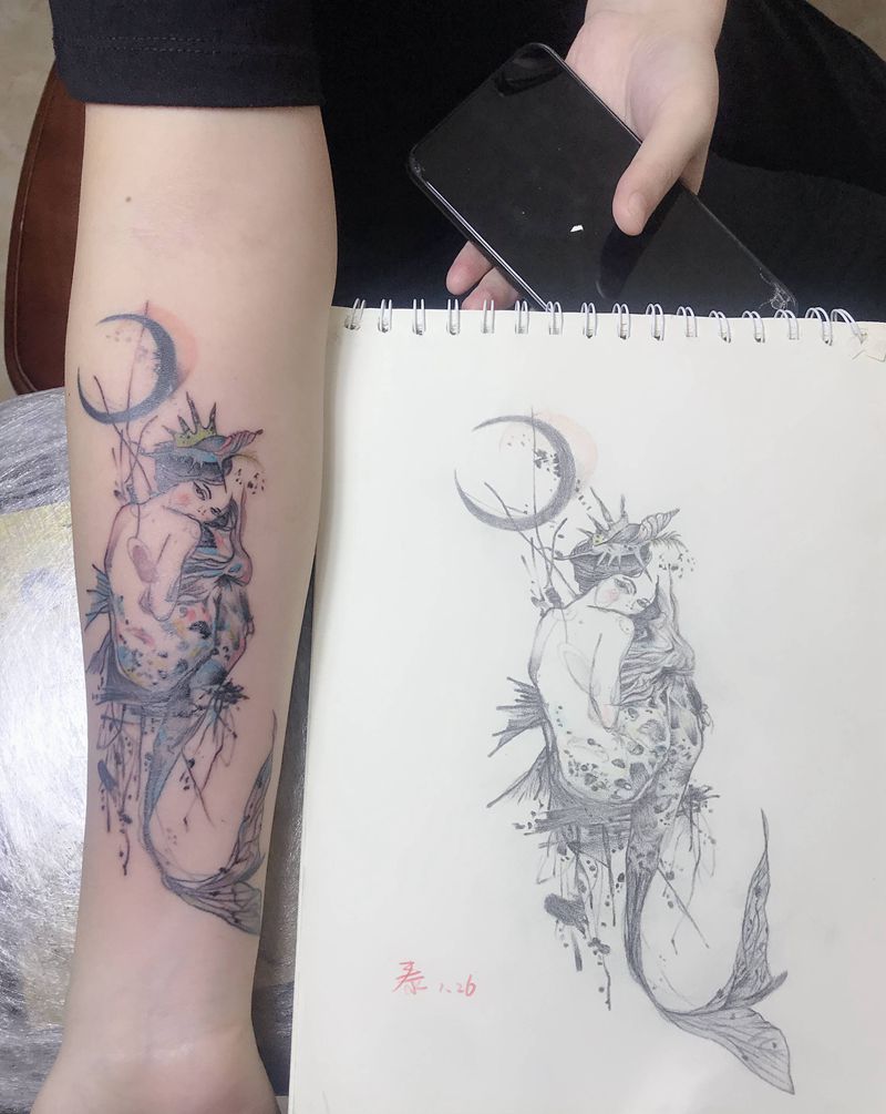 当前位置: 首页 >广东省广州市纹身店-泰塔凸纹身馆纹身图案>手臂美人鱼纹身图片_手臂水彩美人鱼泼墨纹身图案
