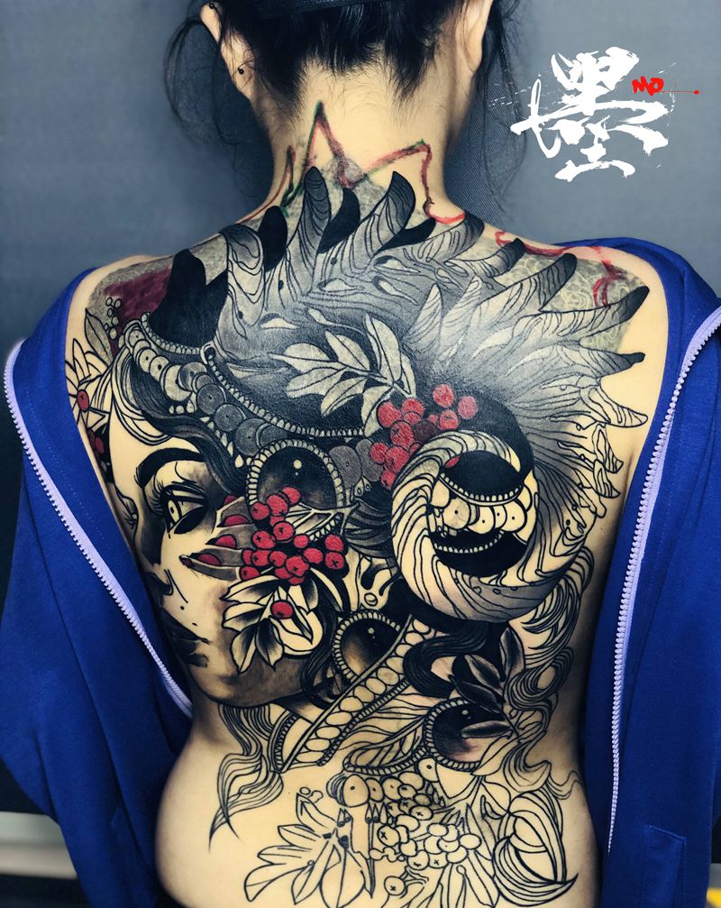 当前位置: 首页 >广东省广州市纹身店-墨刺青工作室纹身图案>#满背纹身#暂时完成60%纹身图片_背部New School欧美写实纹身图案